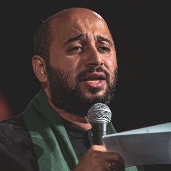Əzum əl-Bəla, yəni səndən ayrı olmaq, Yenə də sənin hərəmində, Ağam, yerimiz boşdur. Sənə fəda olum, mən də "Hüseyn" deməklə sərxoşam, Qəlbimi sənin bayrağına bağlayıram, Ağam.